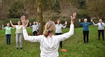 Gymnastik im Möllner Kurpark mit Baum