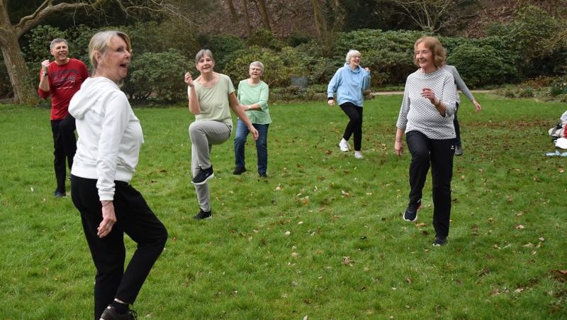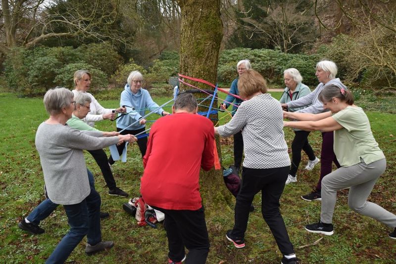 Gymnastik im Möllner Kurpark mit Baum